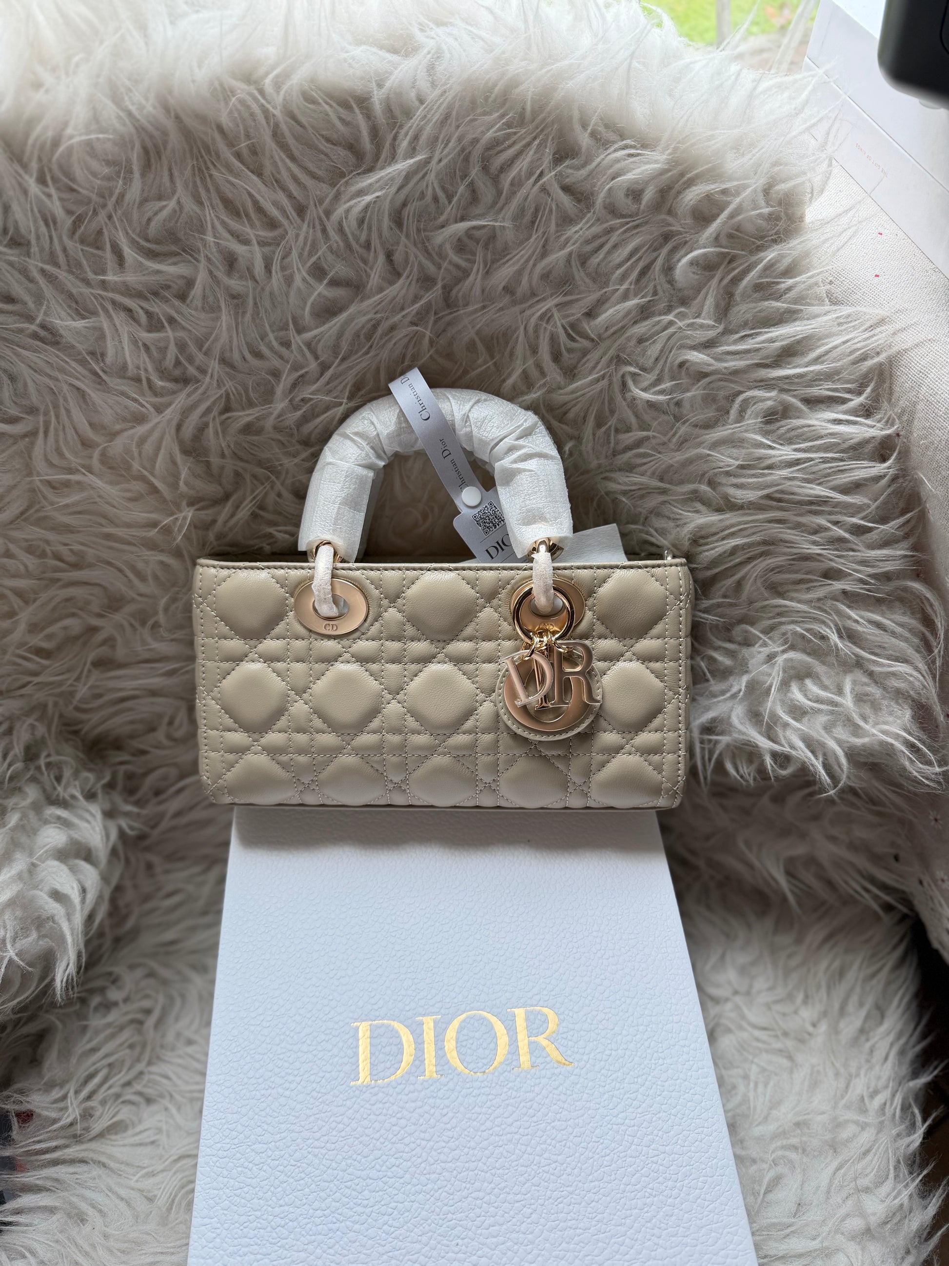 The Lady D-Joy bag captures the House's vision of elegance and beauty by showcasing the iconic streamlined aesthetic of the Lady Dior line. Crafted in powder beige lambskin with Cannage stitching, the refined and timeless style is enhanced and illuminated by pale gold-finish metal D.I.O.R. charms. Featuring one detachable chain shoulder strap and another adjustable and removable leather shoulder strap, the small Lady D-Joy bag can be carried by hand, worn over the shoulder or crossbody as a daily companion.